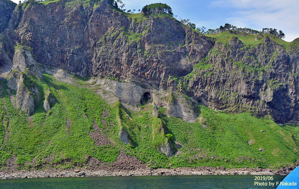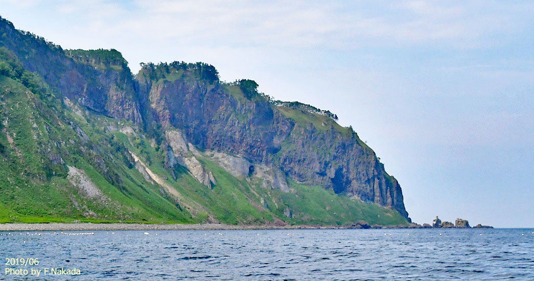 ![]() 「観音岩」の南西側には,標高が285mにも達する巨大な「海食崖」が聳えています。 その海食崖の途中で,はっきりとした地層の境界が存在するのです。 |