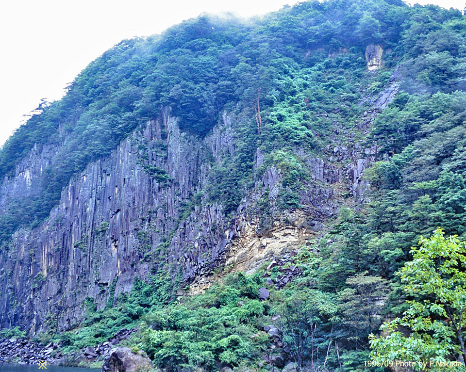 ![]() 「小原の材木岩」は,「平成23年・東北地方太平洋沖地震」による震動で,かなりの箇所で崩壊が発生しました。 従って,現在の状況は,1996年9月に撮影したこの写真画像とは大きく異なっているようです。 注 写真左下の「※印」と,次の写真の「※印」の場所は,ほぼ同じです。 |