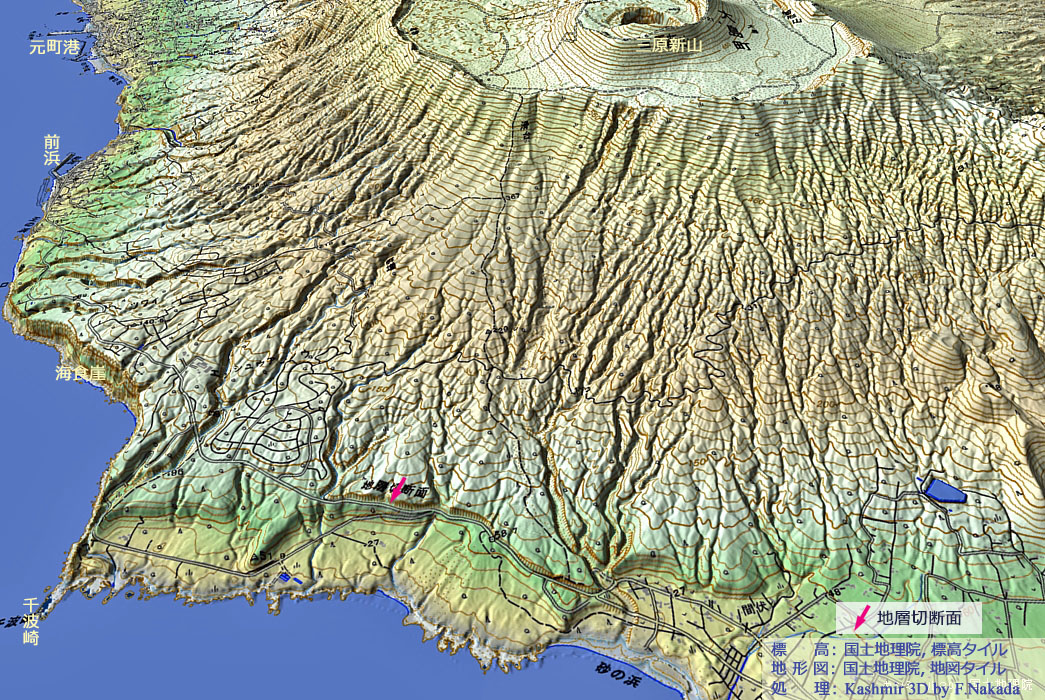 | 投稿者による露頭写真とその説明:三原山の地層説断面 |