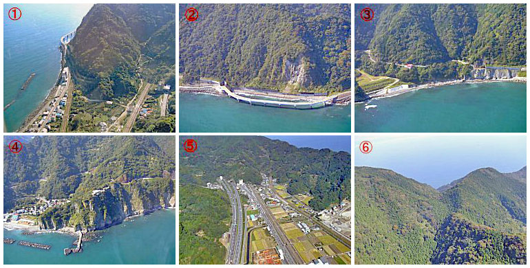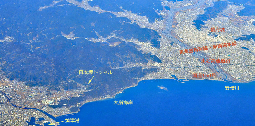 ![]() 東海道新幹線,東海道本線,東名高速道路および国道150号のいずれもが,この「大崩海岸」を避けて,トンネルで通過しています。 なお,国道1号は,当該地域を大きく迂回した山間部を通っています。 |