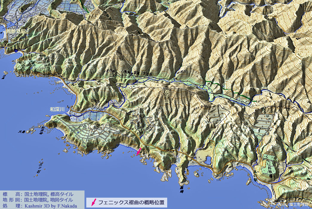 ‼マウスオーバー‼ 地図上にマウスを乗せてください。産総研・地質調査総合センターの「1/20万 シームレス地質図(出典,下記)」を表示します。![]() 産総研・地質調査総合センター発行の「1/20万シームレス地質図」によると,「フェニックス褶曲」付近の地質は, 新生代古第三紀始新世(約4千万年前頃)の「砂岩[海成層]」とされています。 付加体である,とは記載されていません。 しかし,「南紀ジオパーク」の当該褶曲の説明文(下記)では,「牟婁付加体(5千万年前~2千万年前)」であると記載されており, 「後(2017年)」の論文では,「新しい付加体のある牟婁帯」と記載されています。 これほど極端な褶曲は,大洋プレートの沈み込みに伴う運動によるものと思いますが, 事務局ではいずれなのか判断するほどの知見を持ち合わせていません。 |