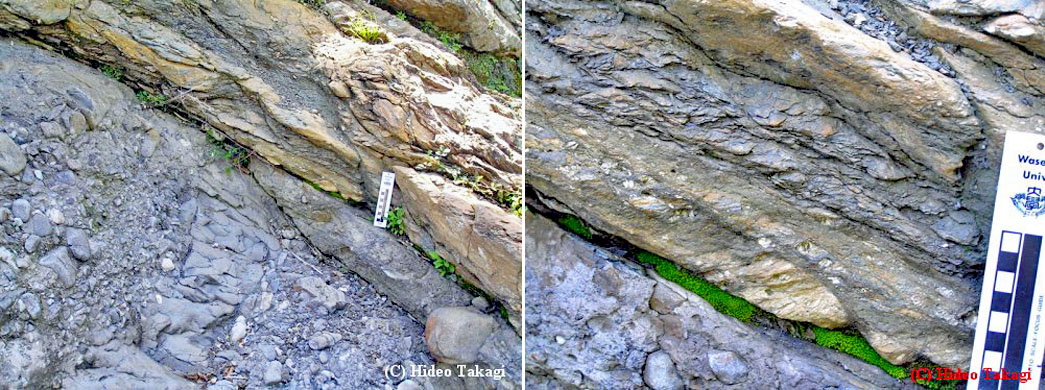 左の写真では,明神層の礫岩とそれに挟まれる砂岩が,衝上運動によって引きずられる様子が観察できます。