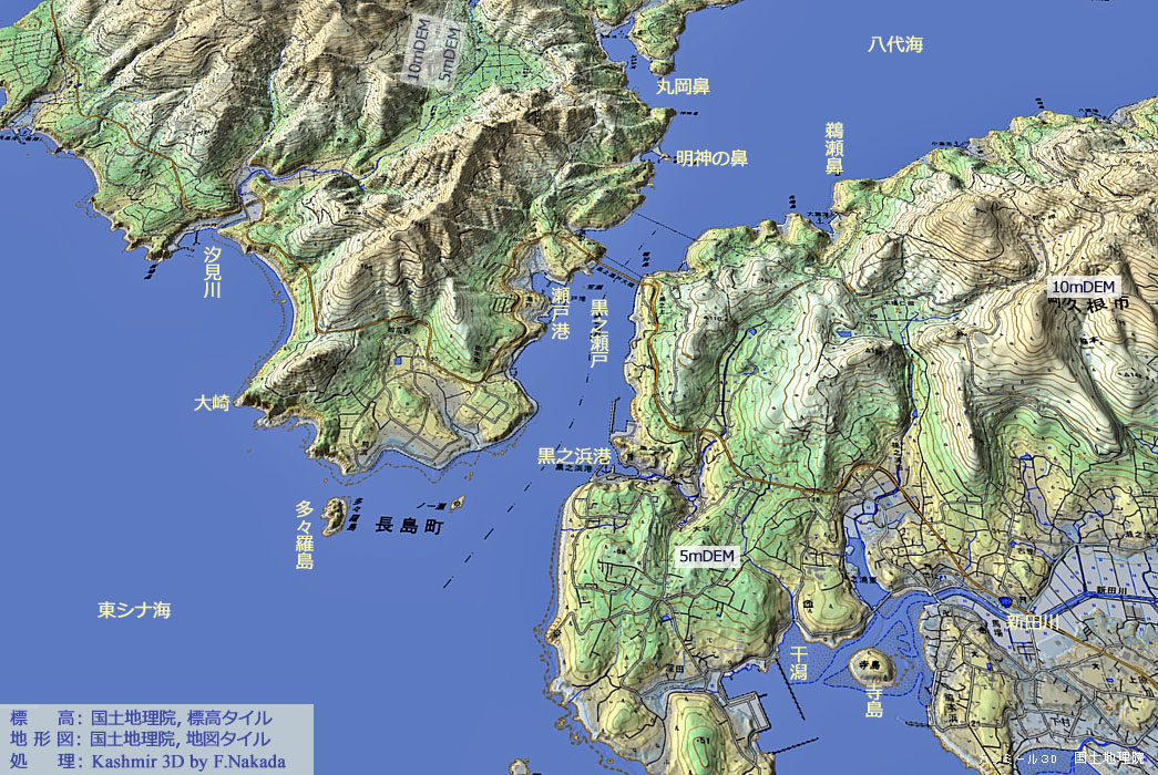 | 地形の三次元イメージ:鹿児島県阿久根市~長島町の「黒之瀬戸」[事務局作成] |
