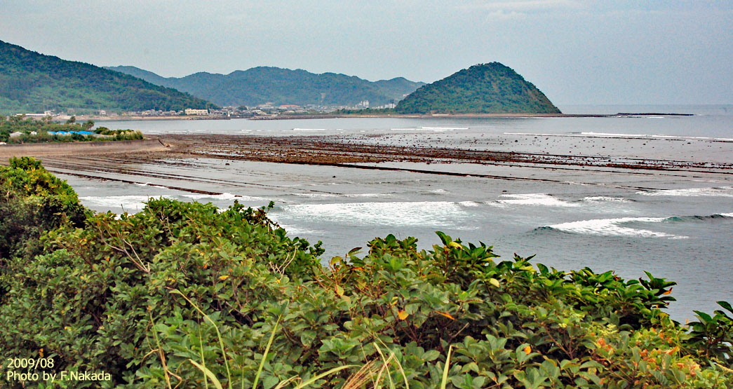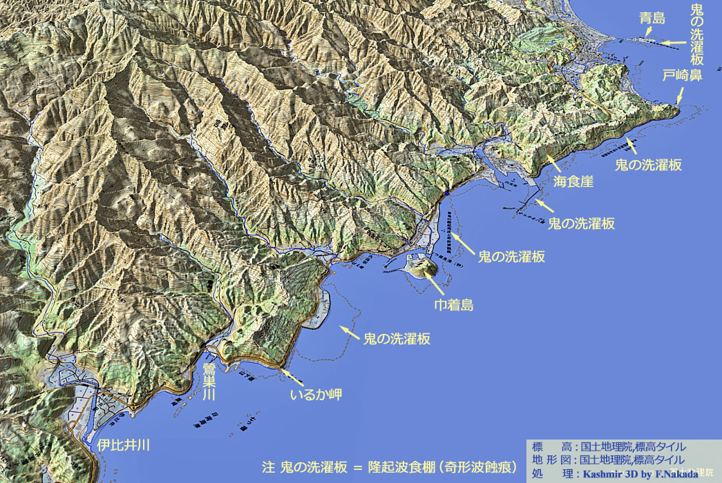 ![]() 「青島」と「戸崎鼻」。 この写真に限り,「戸崎鼻」以南の太平洋岸はすべて「奇形波蝕痕」です。 |