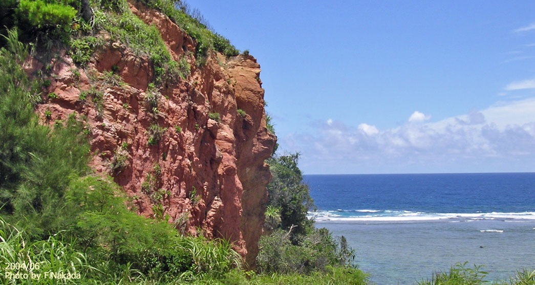 ‼マウスオーバー‼ 地図上にマウスを乗せてください。産総研・地質調査総合センターの「1/20万 シームレス地質図(出典,下記)」を表示します。![]() 山原(やんばる)の東北海岸は,「国頭マージ」と呼ばれる赤い岩石で埋め尽くされています(岩石の詳細は下記)。 本ページで紹介する付近は,「海成段丘面」が分布しており,太平洋に面しては「海食崖」となっています。 で,その崖が赤いのです。 |