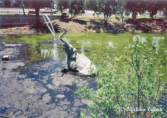 博物館の前の池は,現在でもアスファルトが滲出していて石油くさい。 写真のゾウはコンクリート製である。 ご注意!。