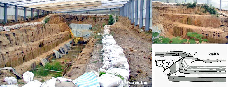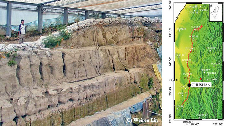 ![]() 台湾竹山(CHUSHAN)で試掘した車籠埔(Chelungpu)断層トレンチの北側断面の写真です。 |
