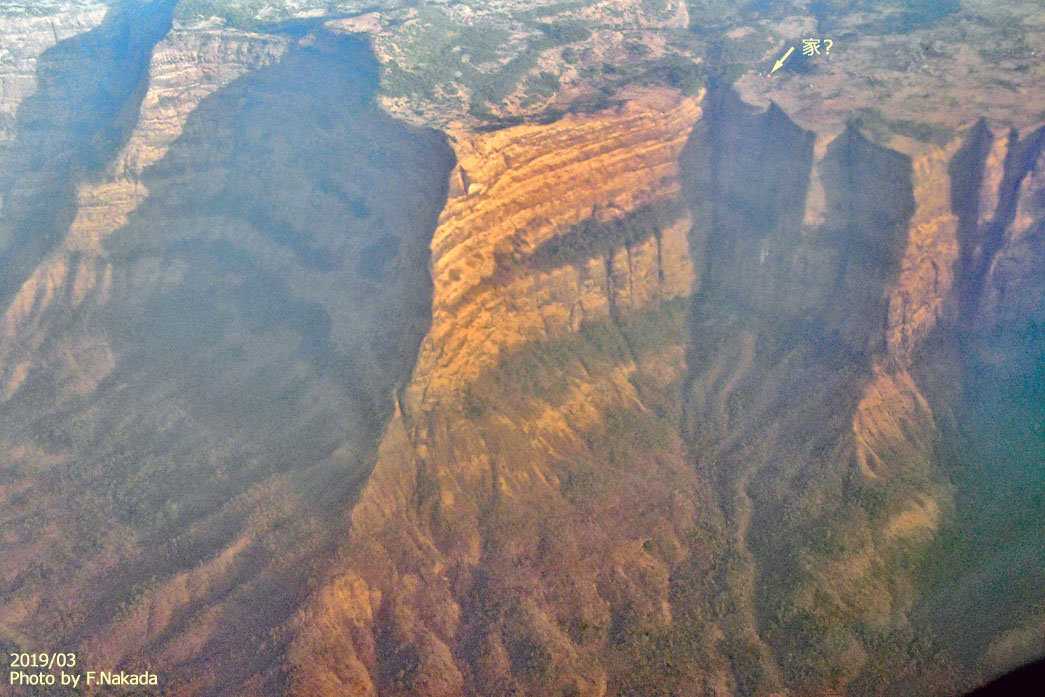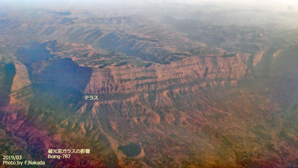 ![]() 日に映える西ガーツ山脈。 断崖絶壁の中間部分にテラスがあることから,ガーツ(階段)という山脈名がつけられたそうです。 写真左下の赤色は,B-787に使われている偏光窓の影響です。 |