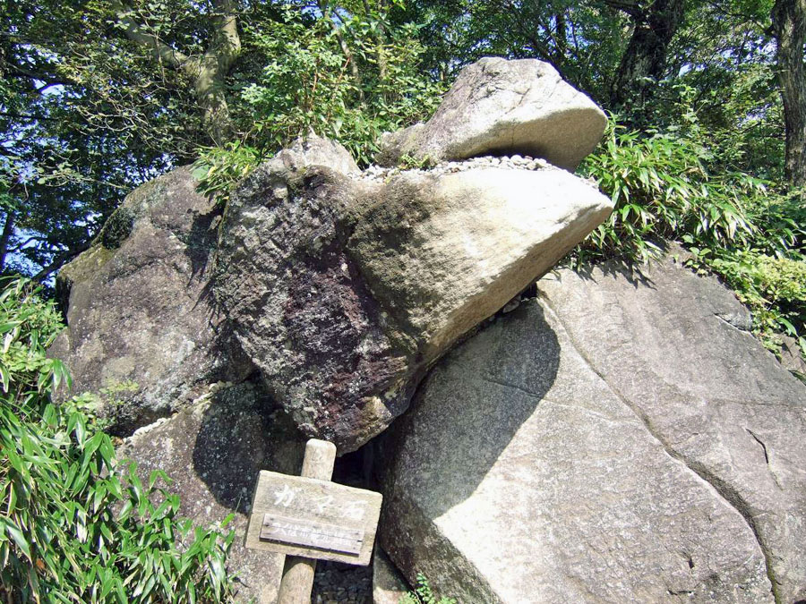 地質等: 筑波山の女体山頂近くの奇岩怪石の一つです。 斑レイ岩からなる巨大な岩の下の土砂が、豪雨や地震時などの地下水によって抜け出てしまい、その結果空洞ができたと考えられます。 |