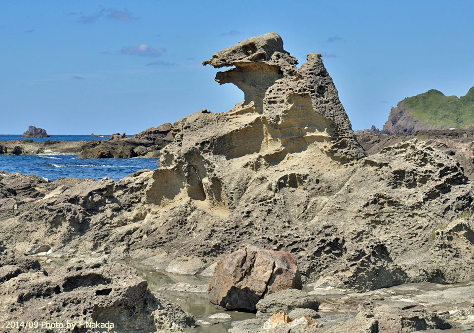 ![]() ゴジラ岩の全景。 風食の一種「タフォニ』による大きな窪みと小さな穴が開いています。 |