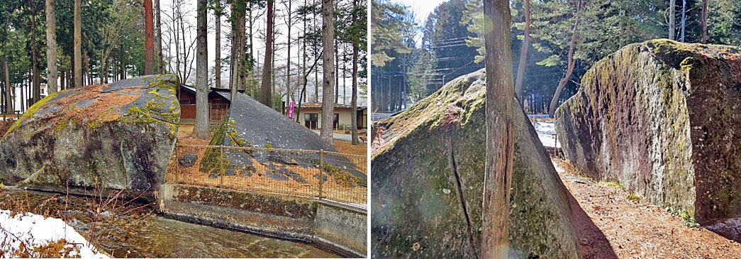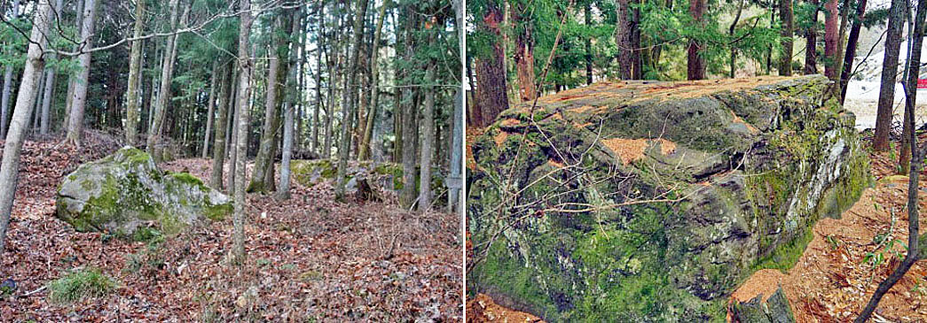 ![]() (左)蛇石の全景。 (右)ござ石の近景。 |