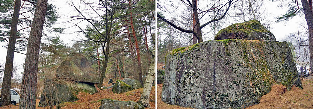 ![]() (左)重ね石の全景 (右)重ね石の近景。 |
