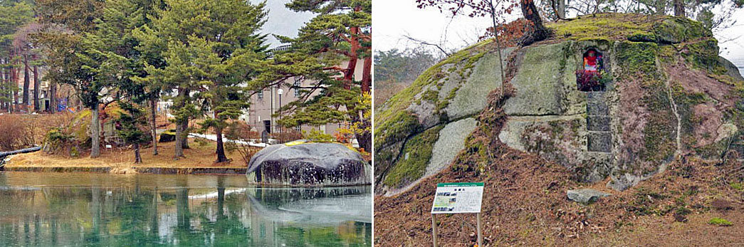 ![]() (左)左の林の中は地蔵石で,右の池の中が袋石。 (右)地蔵石の近景。 |