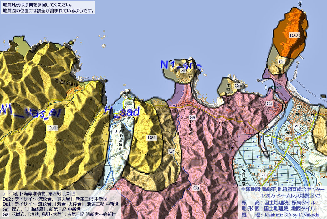 ![]() ![]() 20万分の1 シームレス地質図(出典,下記) |