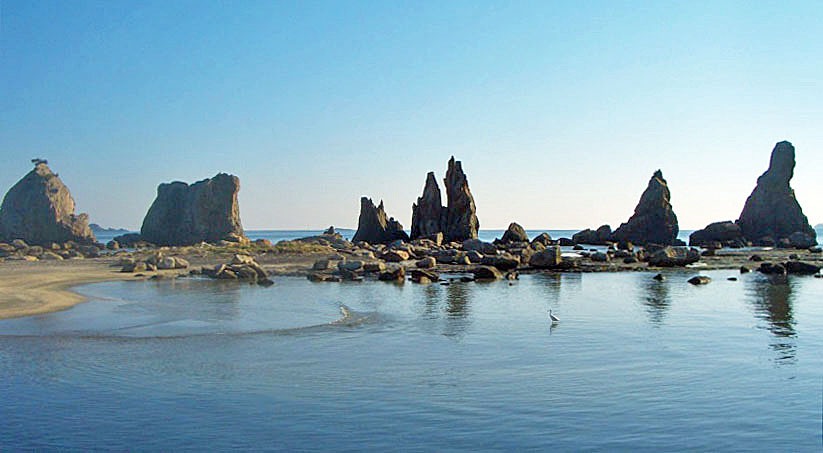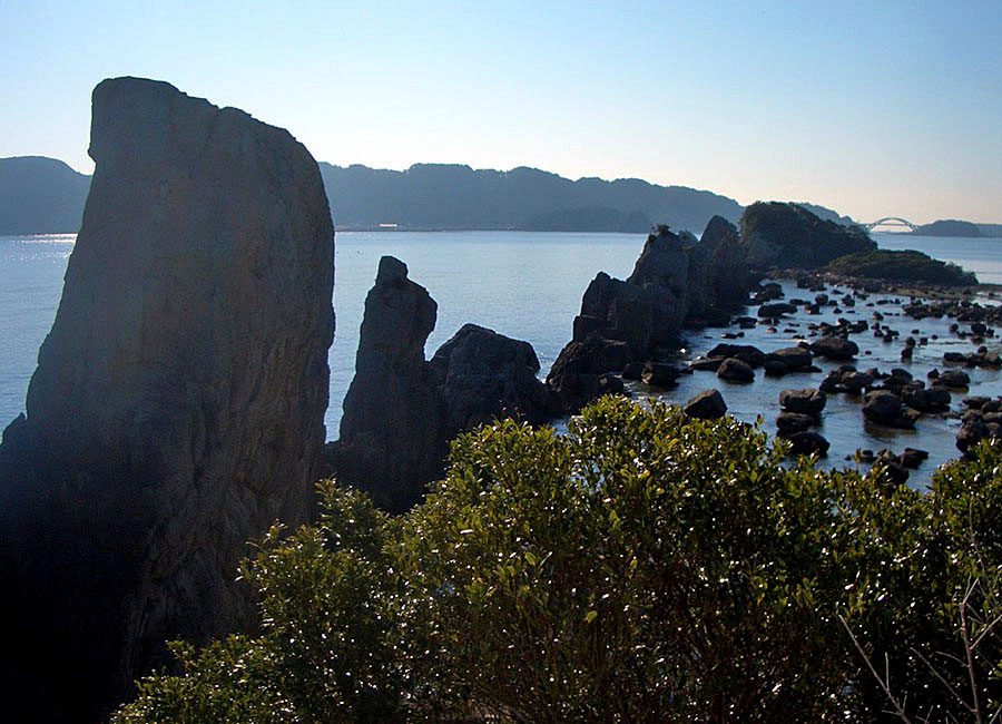 - 串本から大島に向かって,南北におよそ900mにわたり橋脚のような岩塔(橋杭)が直線状に配列しています。