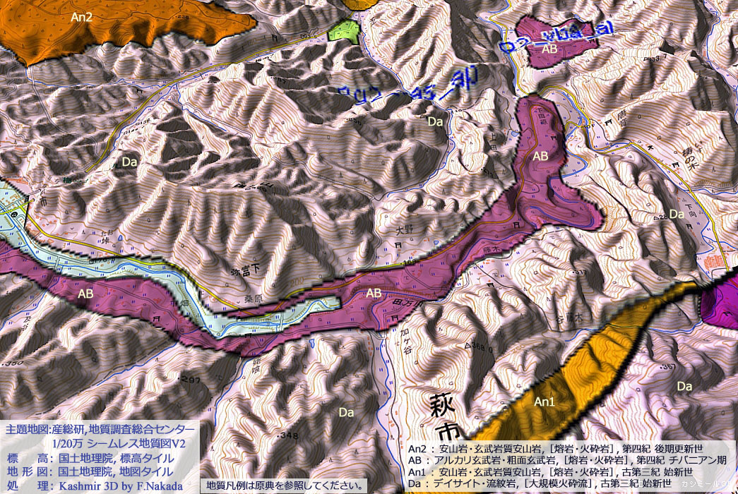 ![]() ![]() 20万分の1 シームレス地質図(出典,下記) |