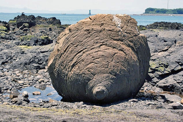- この石灰質団塊は,もともとは地層の中にあったものですが,周囲の「「坂瀬川層」よりも風化浸食に強くしかも大きかったため,地層から出た後もこの場所に残りました。