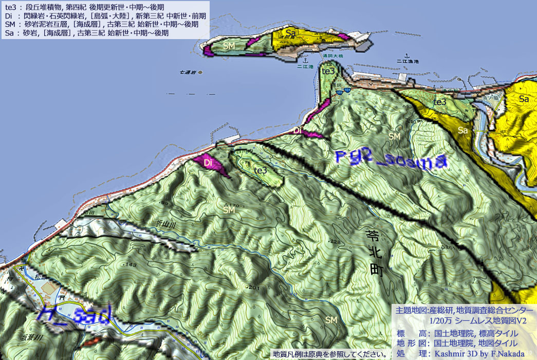 - 「おっぱい岩のある海岸一帯には,古第三紀始新世(約3,800万年前)の「坂瀬川層(SM層)」が分布しています。