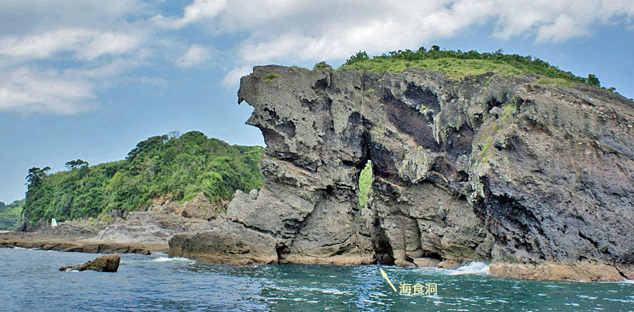 ![]() 獅子吼岬の近景です。 前足と胴体を分ける「海食洞」が写っています。 獅子に見えると言う,表面の激しい凹凸は,「塩類風化」による「タフォニ」です。 |