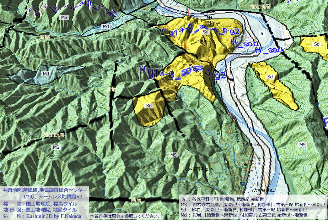![]() ![]() 20万分の1 シームレス地質図(出典,下記) |