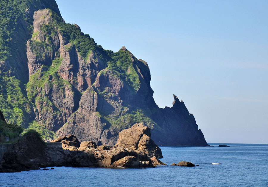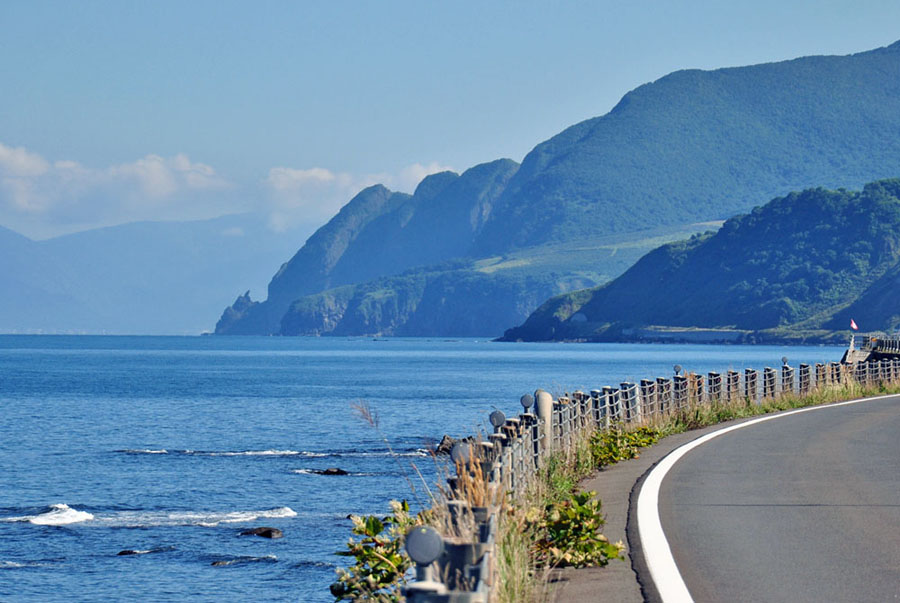![]() 寿都町磯谷町の国道229号からの刀掛岩。遠くは積丹半島。 |