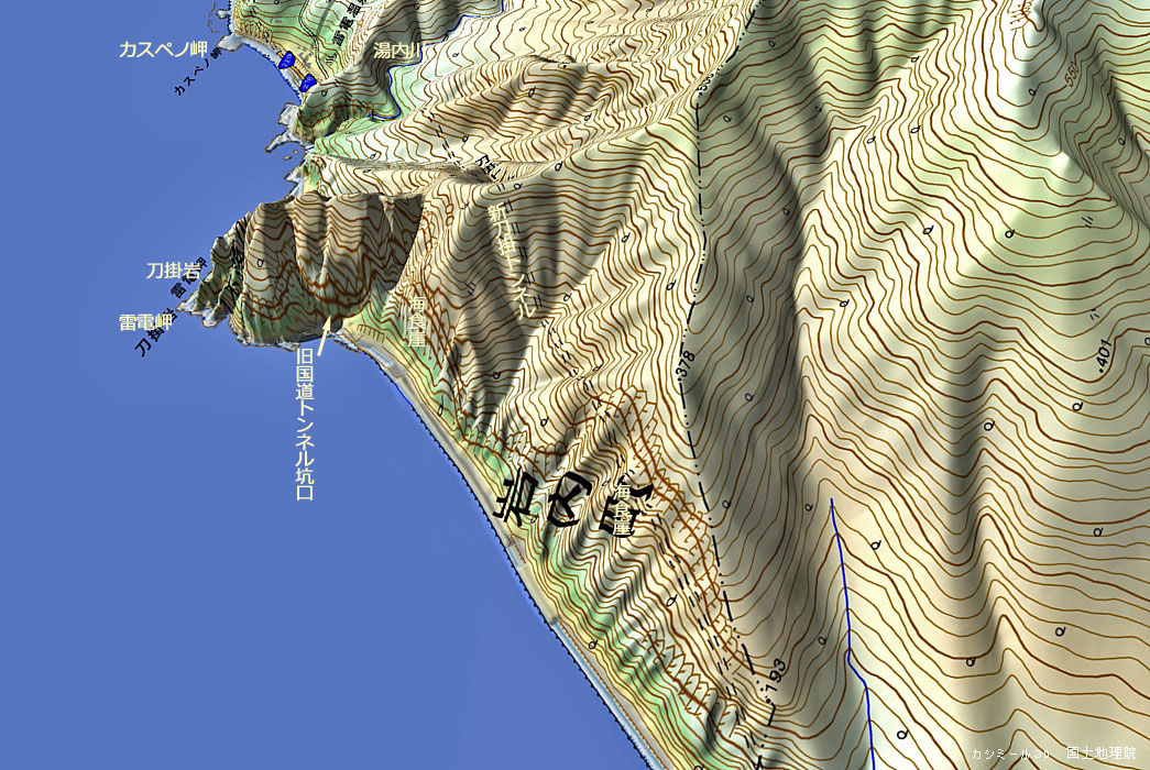 ‼マウスオーバー‼ 地図上にマウスを乗せてください。産総研・地質調査総合センターの「5万分の1地質図幅『島古丹』(出典,下記)」を表示します。![]() 岩内町と蘭越町の境界に位置する「雷電海岸」の地質は,新第三紀の溶岩や火山砕屑岩類(火砕岩)です。 噴出した当時から日本海に接していたためか,波浪による侵食(海食)にさらされ,現在では比高150m以上の断崖絶壁(海食崖)となっています。 |