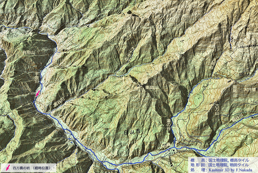 - その際の大出水は,「宮谷川】上流の巨大岩塊を手取川に押し流し,土石流の終着地に百万貫の岩を誕生させました。