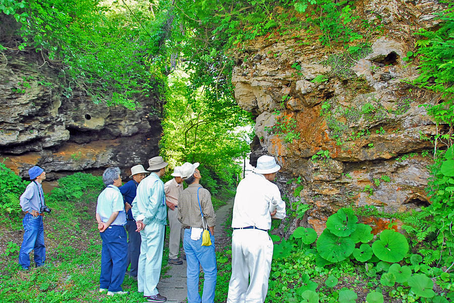 ![]() 「鬼の隠れ道」でのジオツァー(1)。 地層は「湯本トラバーチン」と言う「石灰華」の一種です。 |