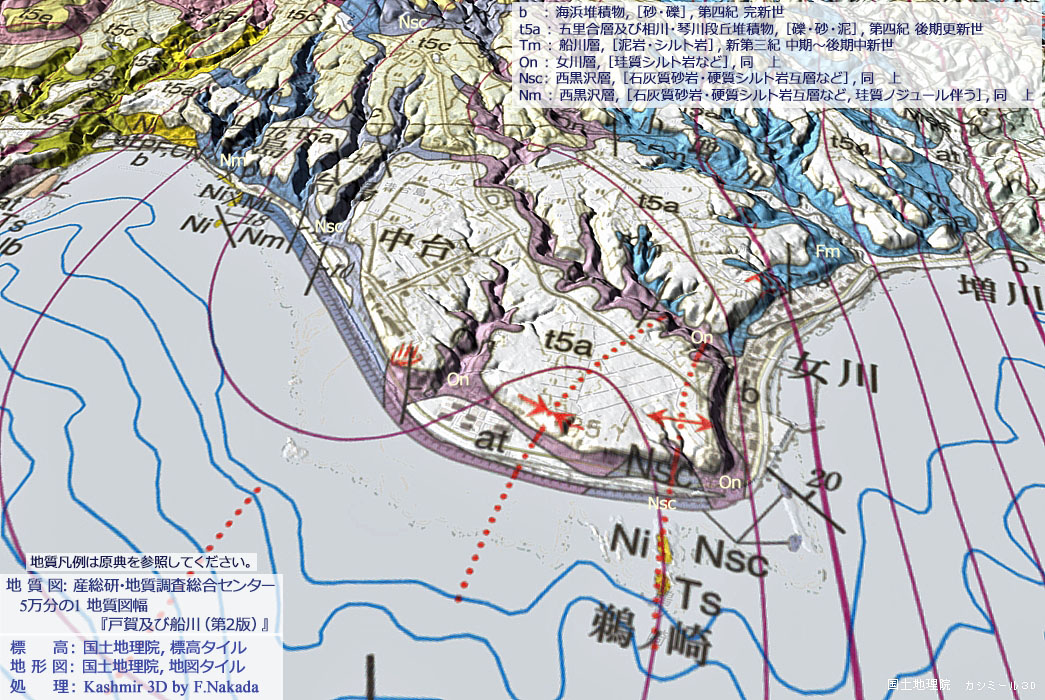 ![]() ![]() 5万分の1地質図幅『戸賀及び船川(第2版)』(出典,下記) |