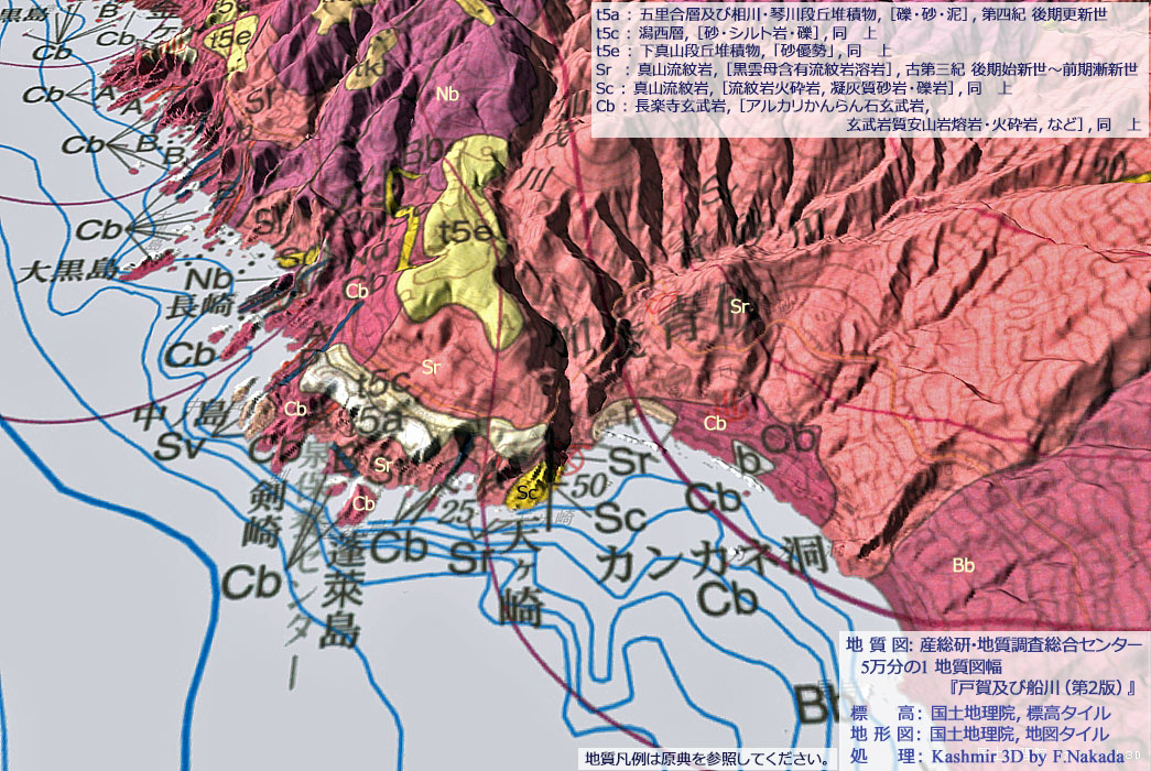 ![]() ![]() 25万分の1地質図幅『戸賀及び船川(第2版)』(出典,下記) |