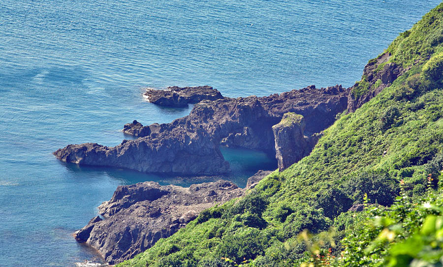 ![]() 舞台島駐車場からの大桟橋。 見づらいですが,海食洞が写っています。 |