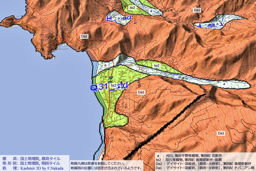 ![]() ![]() 20万分の1 シームレス地質図(出典,下記) |