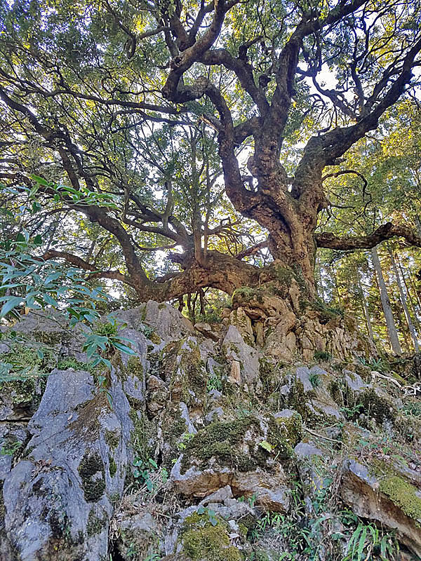 ![]() 山抱きの大樫を育てる,古生代の石灰岩(ジュラ紀付加帯)。 |
