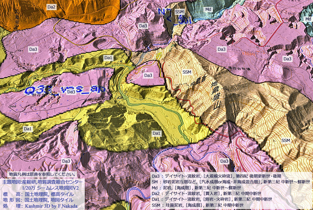 ![]() ![]() 20万分の1 シームレス地質図(出典,下記) |
