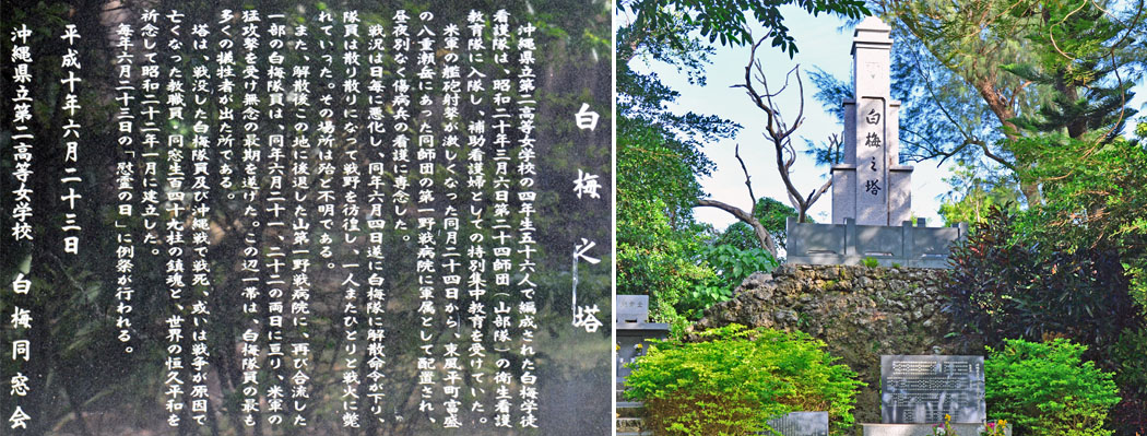 ![]() (左)白梅同窓会による由来碑。 (右)白梅之塔。 |