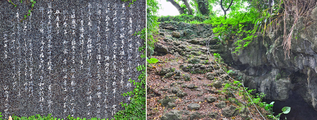 ![]() (左)一枚目の写真に写っている碑文です。 (右)ガマへと続く斜路の途中から,地上を見返しました。 ガマは右の黒い空間の下にあります 。 |
