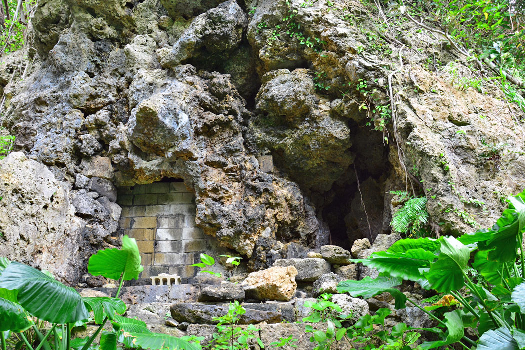 ![]() 壕の内部です。 正面の石垣はいわゆる弾よけで,その奥に防空壕としての機能を持たせた部屋があります。 右の一段下がった暗がりは,もともと使われていた御嶽(うたき)でしょうか 。 |