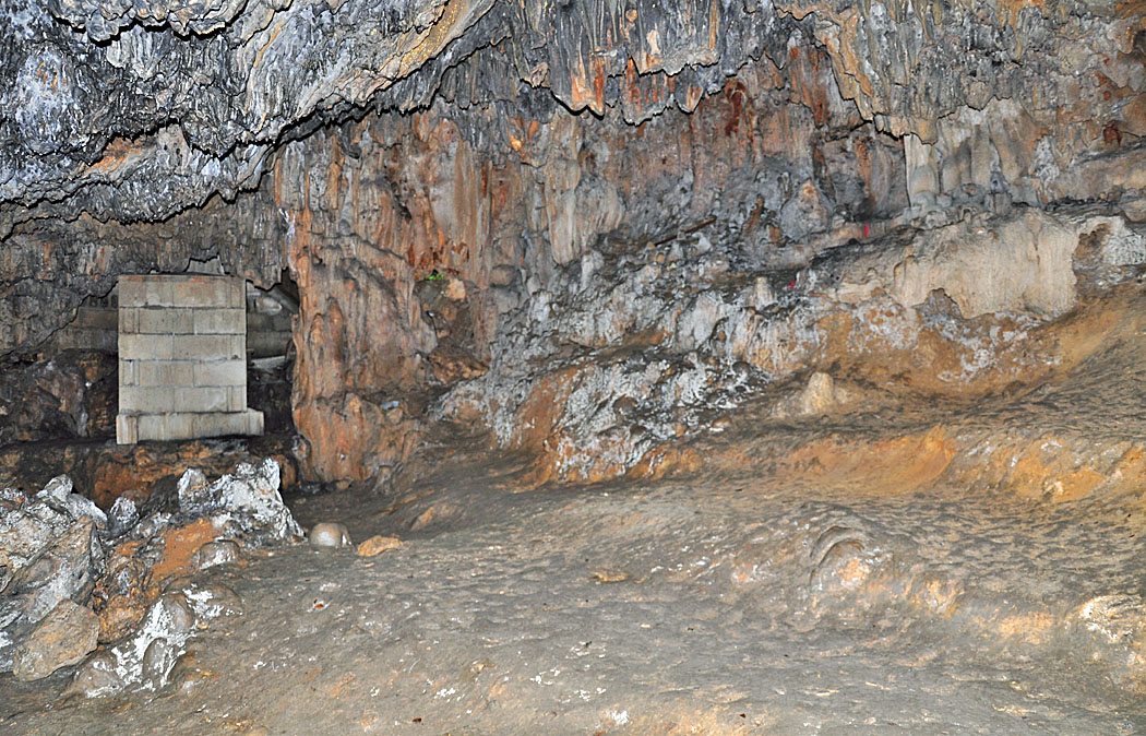![]() 坑口部分を中から見たところです。 左のブロックは拝所と拝壇です。 クチャの床はしめっており,かなり滑る状態です。 撮影:2016年4月。 |