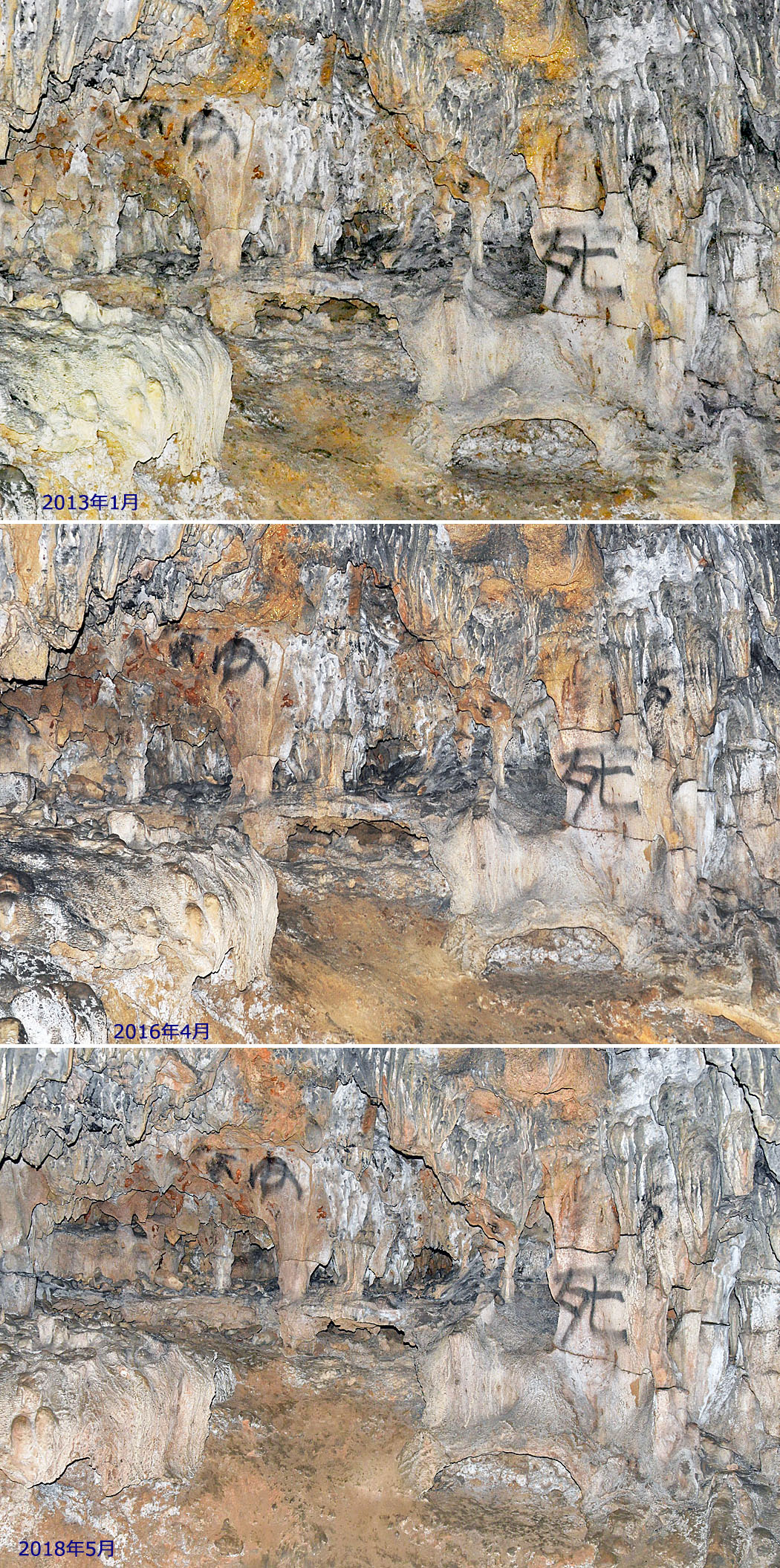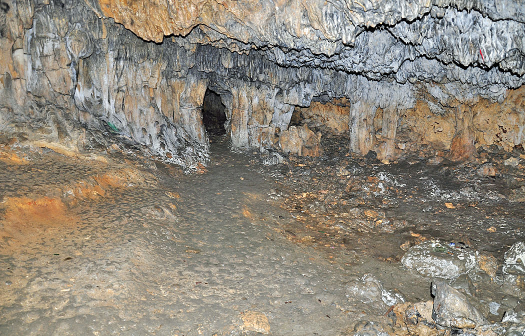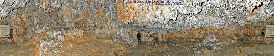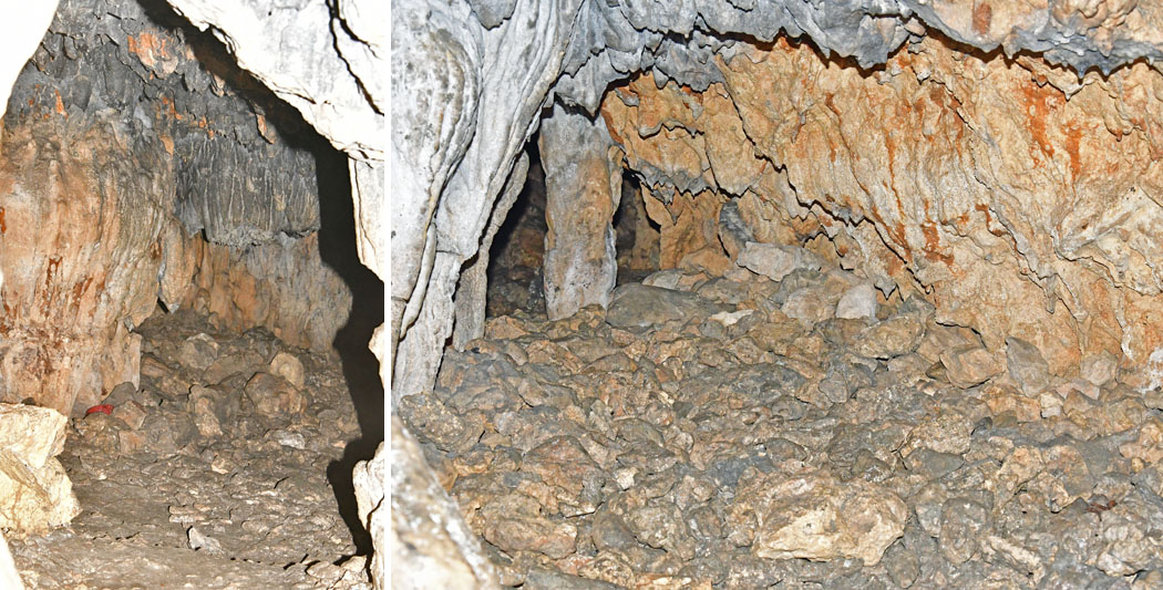 ![]() (左)奥に続く鍾乳洞その1。鍾乳石が切り取られていますが,切断面もすすで汚れているので,壕として使う際に,と思います。 撮影:2018年5月。 (右)奥に続く鍾乳洞その2。 5mほどでその1に繋がっています。赤茶けた壁の部分は、戦後に崩壊したものでしょうか。 撮影:2018年5月。 |