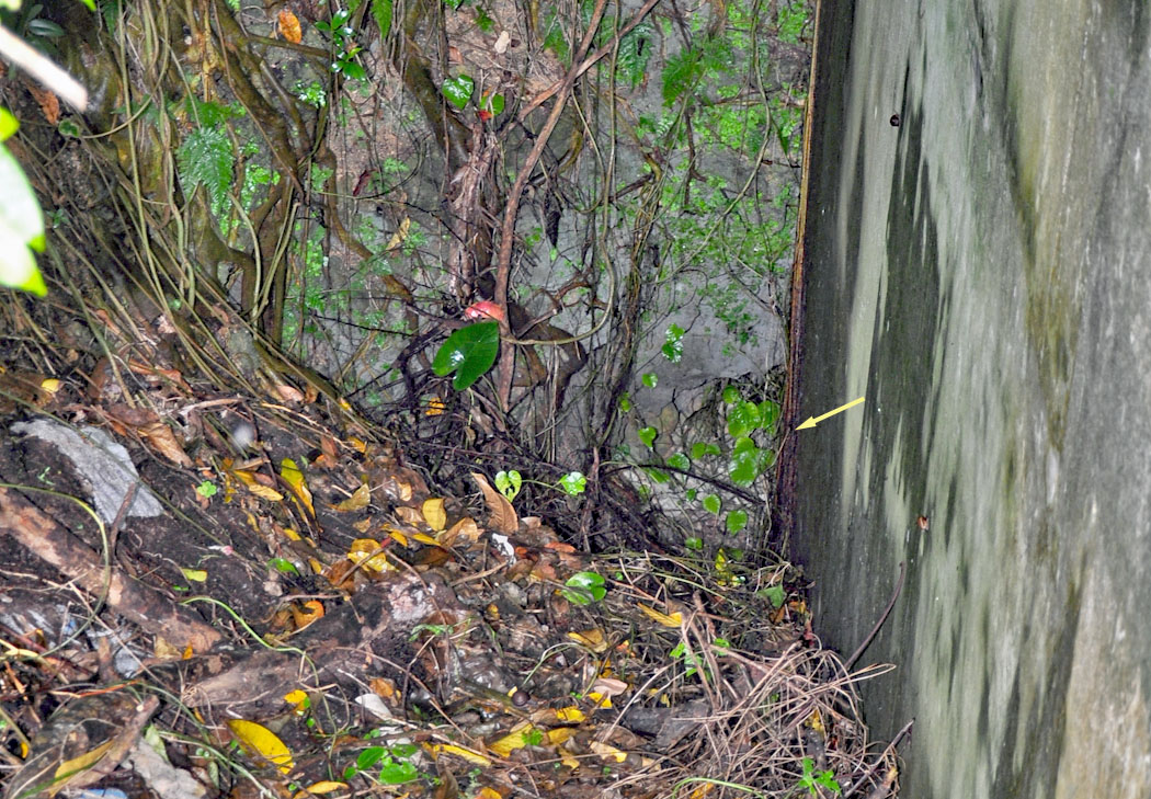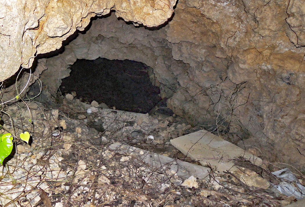 ![]() やっと見つけた壕の入り口(坑口)。 お墓のコンクリートと石灰岩の境界にある,直径50cm程度の丸い穴です。 撮影:2016年 4月(全て)。 |