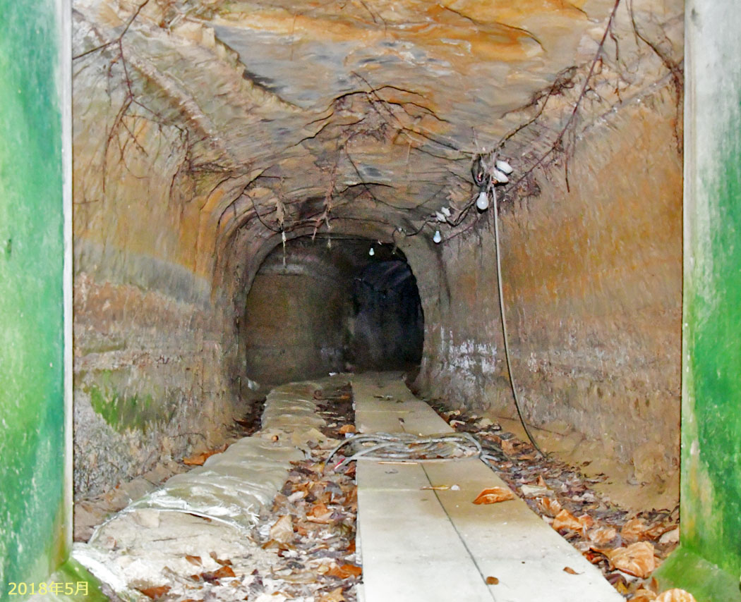 ![]() 「坑口④」の内部です。 終戦後に取り付けられたという電線と電球がそのまま放置されています。 地下壕はやや右に曲がっており,左への分岐壕も確認できます。 |