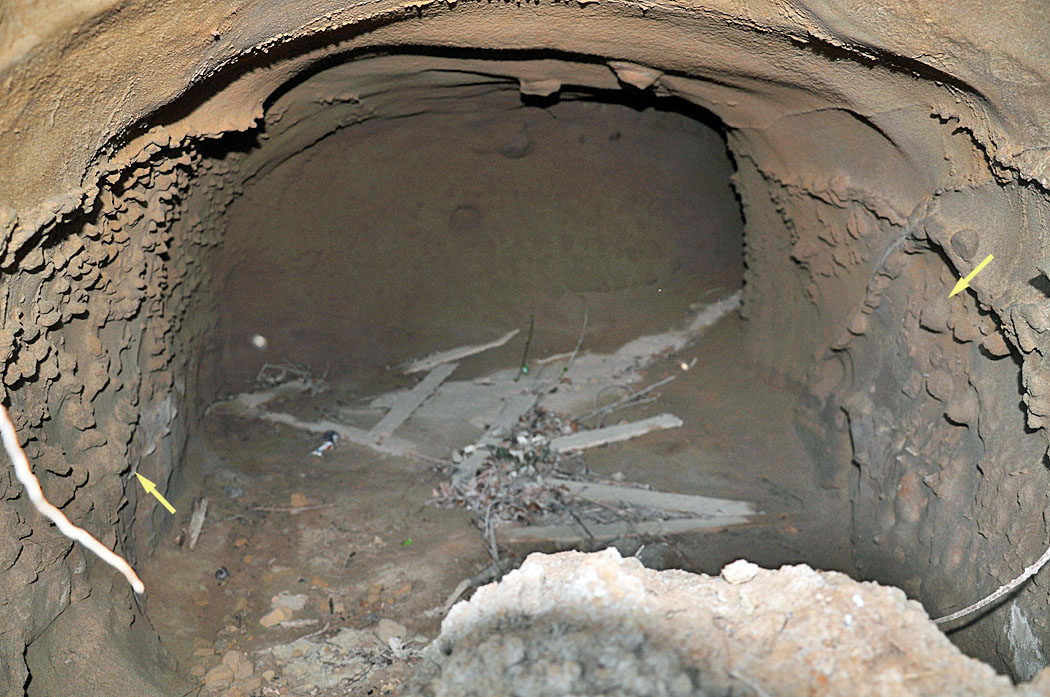 ![]() 壕の内部崩壊は無いようですが,火炎放射機による黒化と溶解の跡(矢印)が残っていました。 反対側の坑口?から地下水が流入した跡が見られました。 撮影:2012年12月。 |