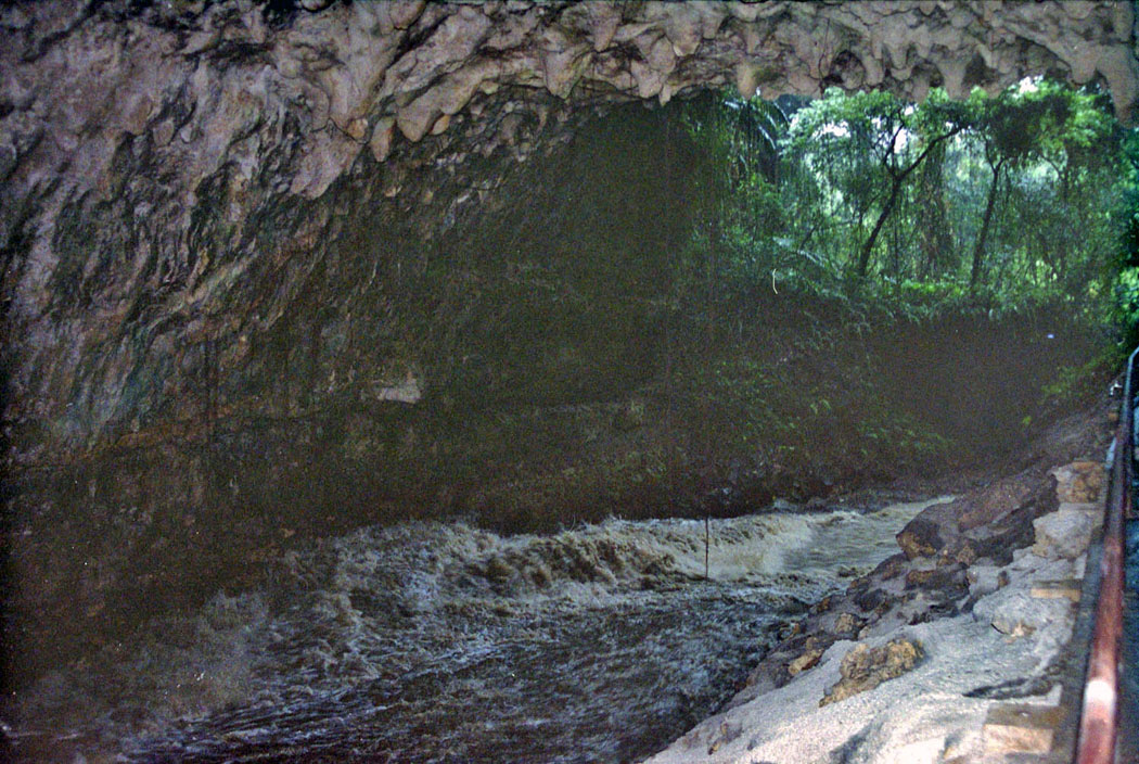 ![]() 大きな鍾乳洞の中を流れる「雄樋川(ゆうひがわ)」。 この日は大雨のため濁流が流れており,この浸食作用で鍾乳洞ができたのだ,という実感が湧きました。 |