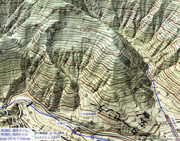 | ①: 主稜線 ②: 山頂緩斜面 ③: 二重山稜 ④: 多重山稜 ⑤: 線状凹地 ⑥: 小崖地形 ⑦: 円弧状クラック ⑧: 岩盤クリープ斜面,あるいは地すべり地形 ⑨: 遷急線(傾斜が変化するところ) 「鈴木 隆介,『建設技術者のための地形図読図入門 第3巻 段丘・丘陵・山地』,古今書院,平成12年5月」を参考に作成しました。 |