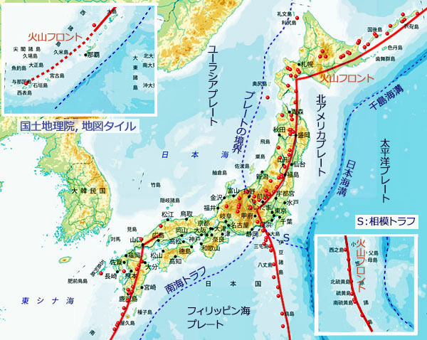 すなわち,左図に示す「火山フロント(前線)」の北西側にのみ火山は分布しているのです。
