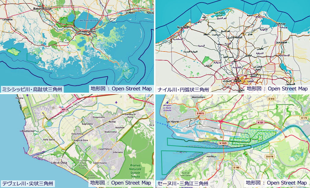 ④ 三角江三角州 : 入江などで遠浅で弱い沿岸流の所に,比較的大きな河川が流れ込んでいる場合に形成されやすいようです。