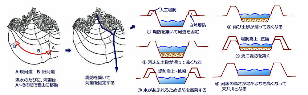 が繰り返されることによって,河床(川底)の高さが地平(平地)より高くなると,天井川と呼ばれるようになります。