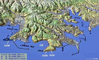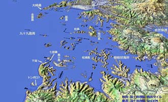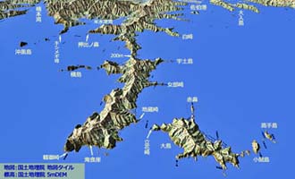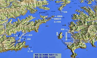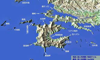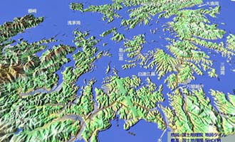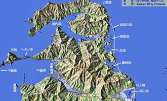 ![]() 「三方五湖」の海面が30m上昇した,あるいはこの場所が30m沈下した,と仮定して作成した「リアス海岸」のイメージです。 |