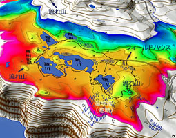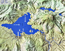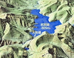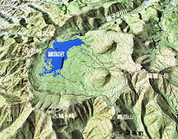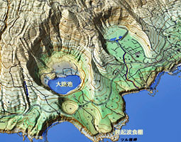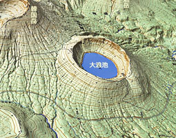 - ┣ カルデラ湖:火山の噴火などで土地が鍋状に陥没し,その窪地(凹地)に水が溜ってできた湖です。