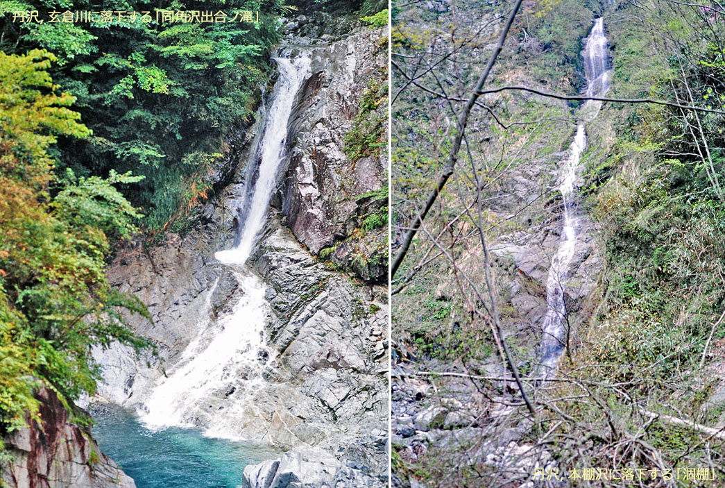 ![]() 「懸谷瀑」とは,本流に直接落下している滝のことで,事務局の新造語です(同義語が見つかりません)。 (左)沢登り族の人たちには有名な?「同角沢出合ノ滝」です。 常時,豊富な落水があります。 (右)融雪時と降雨時にのみ落水のある滝の例です。厳密には滝ではないそうですが,このような滝は,かなり多いという印象を持っています。 |
